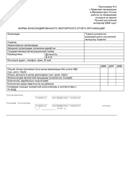 - 2136Форма консолидированного экспортного отчета организации для участия в конкурсе, проводимом Минпромторгом России на звание «Лучший российский экспортер 2008 года» в номинации «Самый динамично развивающийся российский экспортер отрасли»