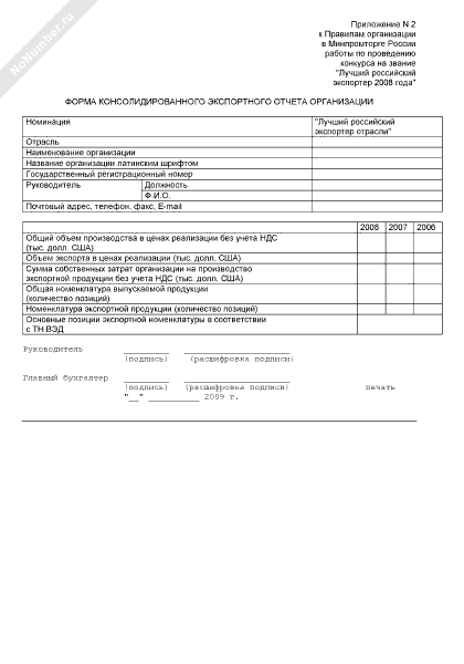 - 2134Форма консолидированного экспортного отчета организации для участия в конкурсе, проводимом Минпромторгом России на звание «Лучший российский экспортер 2008 года» в номинации «Лучший российский экспортер отрасли»
