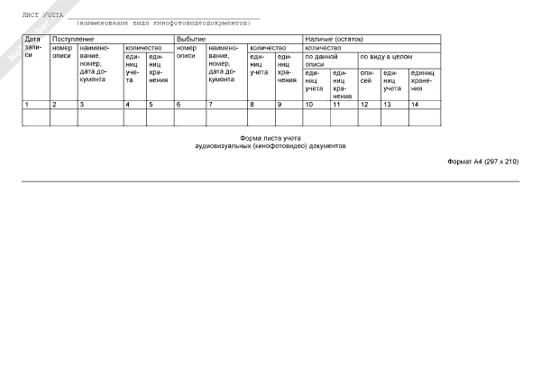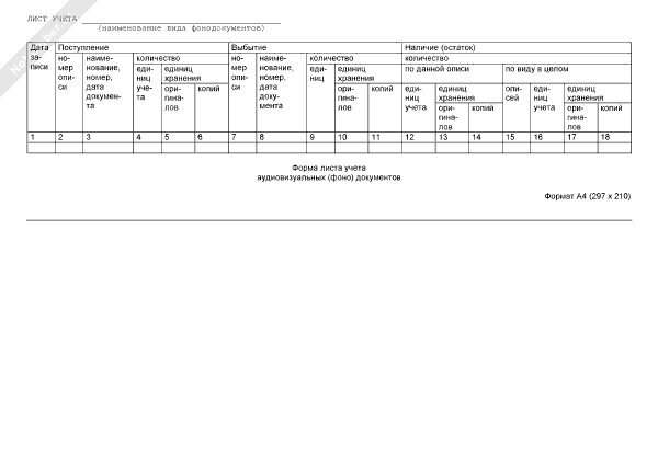 - 2162Форма листа учета аудиовизуальных фонодокументов в архивном фонде Российской Федерации, государственных и муниципальных архивах, музеях и библиотеках, организациях Российской академии наук