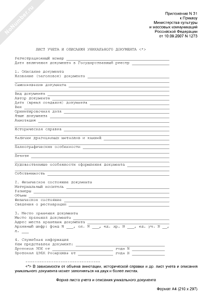 - 2163Форма листа учета и описания уникального документа в архивном фонде Российской Федерации, государственных и муниципальных архивах, музеях и библиотеках, организациях Российской академии наук