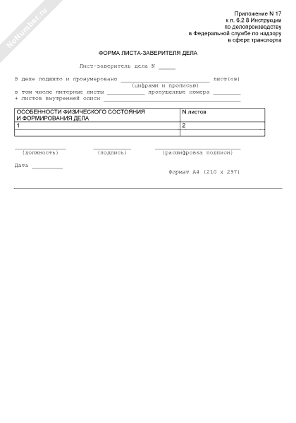 - 2168Форма листа-заверителя дела в Федеральной службе по надзору в сфере транспорта