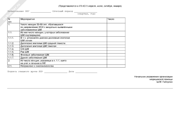 - 2415Форма отчета ЛПУ, имеющего в структуре цитологическую лабораторию, о мероприятиях по реализации подпрограммы «Целевая диспансеризация женского населения по выявлению заболеваний шейки матки»
