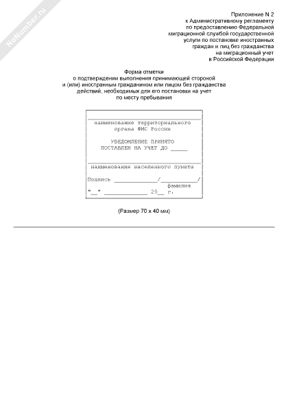 - 2405Форма отметки о подтверждении выполнения принимающей стороной и (или) иностранным гражданином или лицом без гражданства действий, необходимых для его постановки на учет по месту пребывания