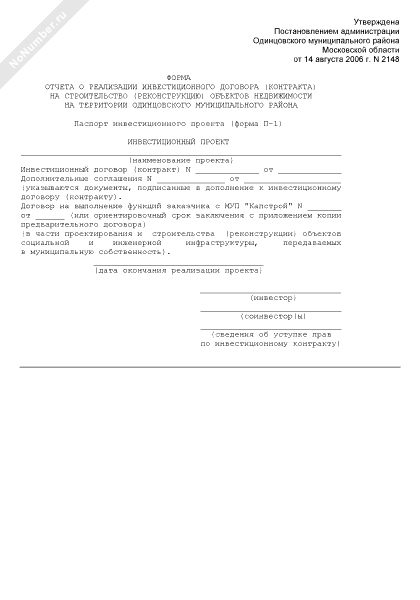- 2425Форма отчета о реализации инвестиционного договора (контракта) на строительство (реконструкцию) объектов недвижимости на территории Одинцовского муниципального района. Паспорт инвестиционного проекта. Форма № П-1