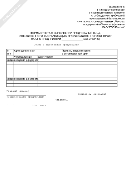 - 2439Форма отчета о выполнении предписаний лица, ответственного за организацию производственного контроля на опасных производственных объектах предприятий (АО-энерго) (приложение к типовому положению о производственном контроле за соблюдением требований промышленной безопасности на опасных производственных объектах предприятий АО-энерго (филиала) РАО «ЕЭС России»)