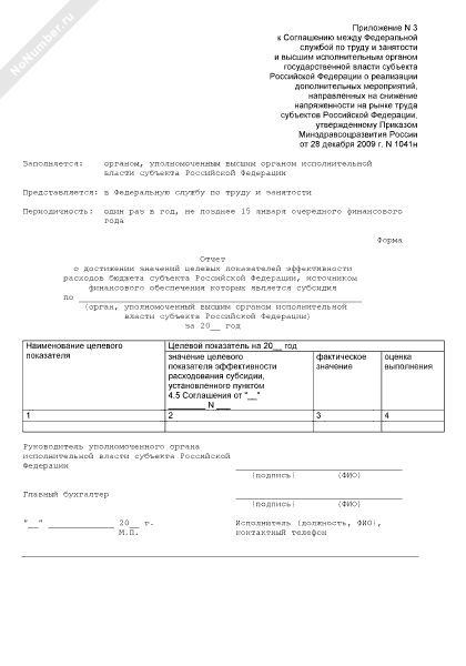- 2448Форма отчета о достижении значений целевых показателей эффективности расходов бюджета субъекта Российской Федерации, источником финансового обеспечения которых является субсидия (приложение к соглашению между Федеральной службой по труду и занятости и высшим исполнительным органом государственной власти субъекта Российской Федерации о реализации дополнительных мероприятий, направленных на снижение напряженности на рынке труда субъектов Российской Федерации)