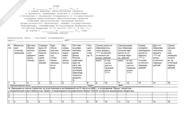 - 2447Форма отчета о суммах выданных образовательных кредитов и процентах, подлежащих отсрочке в соответствии с Положением о проведении эксперимента по государственной поддержке предоставления образовательных кредитов студентам образовательных учреждений высшего профессионального образования, имеющих государственную аккредитацию, утвержденным Постановлением Правительства Российской Федерации от 28 августа 2009 г. № 699