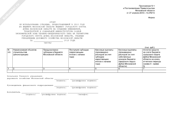 - 2458Форма отчета об использовании субсидии, предоставляемой в 2010 году из бюджета Московской области бюджету городского округа Дубна Московской области на создание инженерной, транспортной и социальной инфраструктуры особой экономической зоны технико-внедренческого типа на территории городского округа Дубна Московской области, главным управлением дорожного хозяйства Московской области