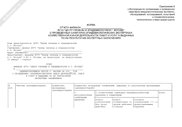 - 2507Форма отчета филиала ФГУЗ «Центр гигиены и эпидемиологии в г. Москве» о проведенных санитарно-эпидемиологических экспертизах хозяйственной и иной деятельности, работ и услуг и выданных по их результатам экспертных заключениях