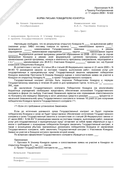 - 2672Форма письма единственному допущенному участнику размещения заказа на выполнение работ (оказание услуг) по проекту, проводимому в рамках реализации федеральных целевых, государственных и иных программ в сфере образования, воспитания и развития общедоступных образовательных ресурсов