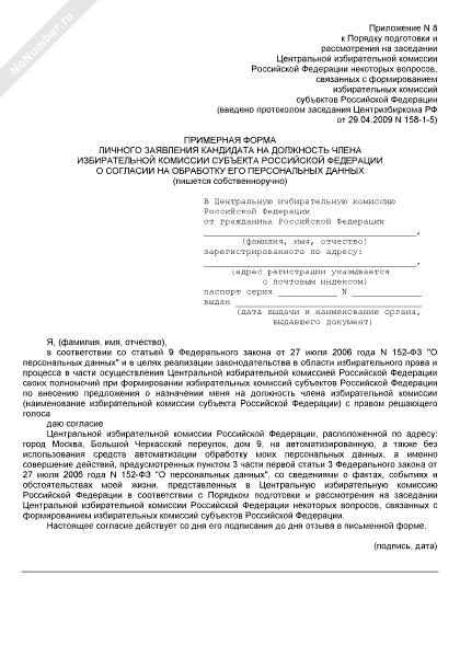 - 314Примерная форма личного заявления кандидата на должность члена избирательной комиссии субъекта Российской Федерации о согласии на обработку его персональных данных