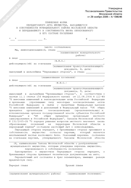 - 319Примерная форма передаточного акта имущества, находящегося в собственности муниципального района Московской области и передаваемого в собственность вновь образованного в его составе поселения