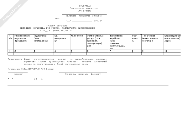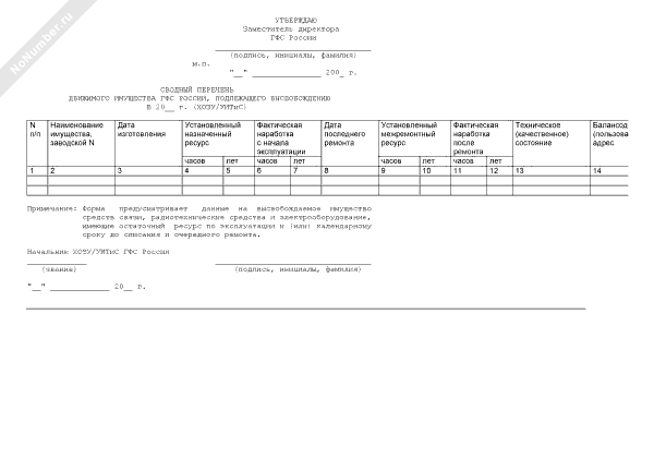 - 3248Форма сводного перечня движимого имущества (средства связи, радиотехнические средства и электрооборудование, имеющие остаточный ресурс по эксплуатации и (или) календарному сроку до списания и очередного ремонта) ГФС России, подлежащего высвобождению