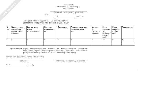 - 3250Форма сводного плана продажи движимого имущества (кроме транспортных средств, имеющее остаточный ресурс по эксплуатации и (или) календарному сроку) ГФС России