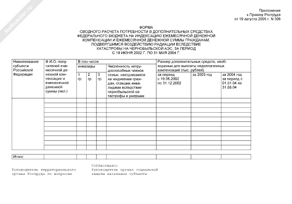 - 3244Форма сводного расчета потребности в дополнительных средствах федерального бюджета на индексацию ежемесячной денежной компенсации и ежемесячной денежной суммы гражданам, подвергшимся воздействию радиации вследствие катастрофы на Чернобыльской АЭС