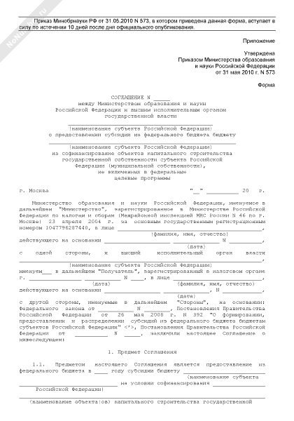 - 3345Форма соглашения между Министерством образования и науки Российской Федерации и высшим исполнительным органом государственной власти субъекта Российской Федерации о предоставлении субсидии из федерального бюджета бюджету субъекта Российской Федерации на софинансирование объектов капитального строительства государственной собственности субъекта Российской Федерации (муниципальной собственности) в рамках федеральной целевой программы