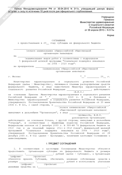 - 3342Форма соглашения о предоставлении Министерством здравоохранения и социального развития Российской Федерации субсидий из федерального бюджета общероссийским общественным организациям инвалидов на реализацию мероприятий по увеличению производственных мощностей, созданию на предприятиях, единственным учредителем которых являются организации инвалидов, новых рабочих мест для инвалидов и по внедрению в производство новых технических средств реабилитации инвалидов