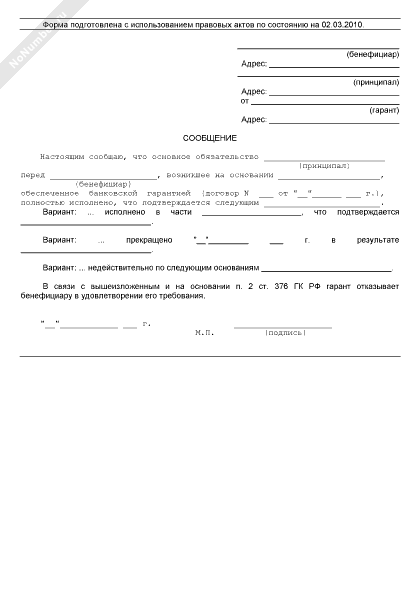 - 3352Форма сообщения гаранта о том, что основное обязательство, обеспеченное банковской гарантией, полностью или в соответствующей части уже исполнено, прекратилось по иным основаниям либо недействительно