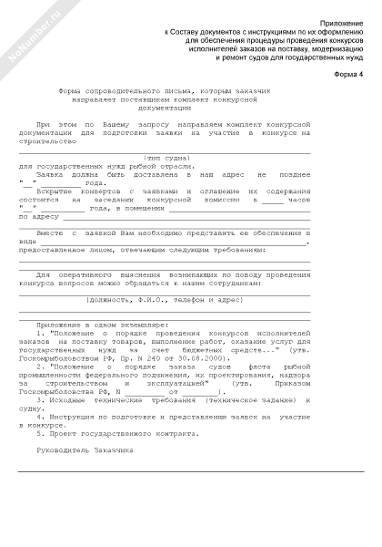 - 3355Форма сопроводительного письма, которым заказчик направляет поставщикам комплект конкурсной документации для подготовки заявки на участие в конкурсе на строительство судов для государственных нужд рыбной отрасли. Форма 4