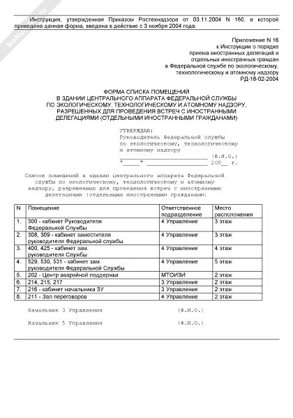 - 3385Форма списка помещений в здании центрального аппарата Федеральной службы по экологическому, технологическому и атомному надзору, разрешенных для проведения встреч с иностранными делегациями (отдельными иностранными гражданами)