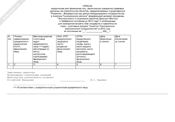 - 3391Форма списка юридических или физических лиц, заключивших гражданско-правовые договоры на строительство объектов, предусмотренных подпрограммой «Развитие г. Владивостока как центра международного сотрудничества в Азиатско-Тихоокеанском регионе» федеральной целевой программы «Экономическое и социальное развитие Дальнего Востока и Забайкалья на период до 2013 года» и необходимых для проведения встречи глав государств и правительств стран — участников форума «Азиатско-Тихоокеанское экономическое сотрудничество» в 2012 году