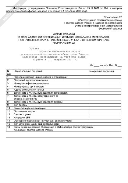 - 3400Форма справки о поднадзорной организации и/или зонах баланса материалов, поставленных на учет или снятых с учета в отчетном квартале. Форма № ФЗ ям-02
