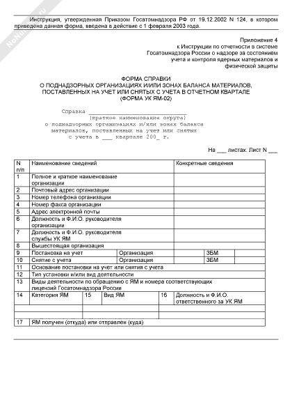 - 3398Форма справки о поднадзорных организациях и/или зонах баланса материалов, поставленных на учет или снятых с учета в отчетном квартале. Форма № УК ям-02