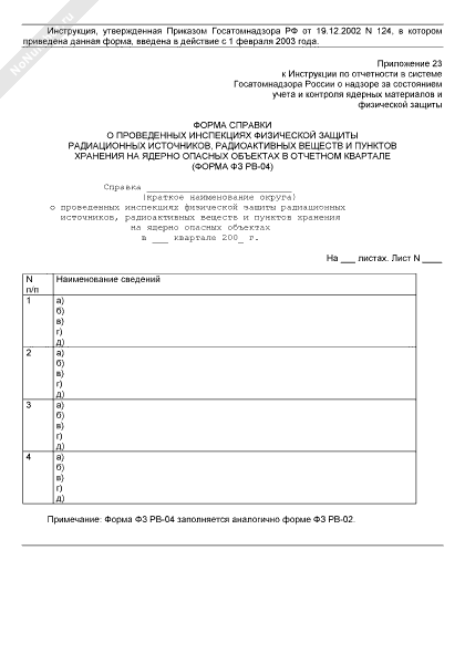- 3397Форма справки о проведенных инспекциях физической защиты радиационных источников, радиоактивных веществ и пунктов хранения на ядерно опасных объектах в отчетном квартале. Форма № ФЗ РВ-04