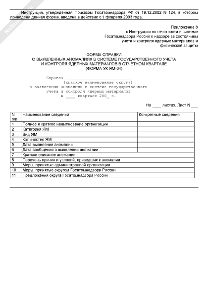- 3396Форма справки о выявленных аномалиях в системе государственного учета и контроля ядерных материалов в отчетном квартале. Форма № УК ям-04