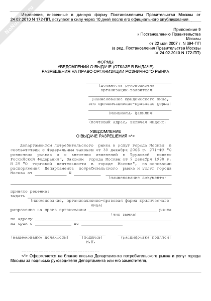 - 3580Форма уведомления о выдаче разрешения на право организации розничного рынка в городе Москве