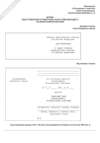 - 3677Форма удостоверения к памятному знаку командующего космическими войсками