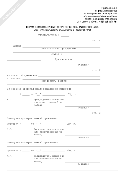 - 3670Форма удостоверения о проверке знаний персонала, обслуживающего воздушные резервуары подвижного состава железных дорог Российской Федерации