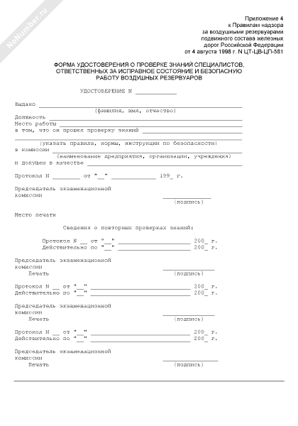- 3671Форма удостоверения о проверке знаний специалистов, ответственных за исправное состояние и безопасную работу воздушных резервуаров подвижного состава железных дорог Российской Федерации