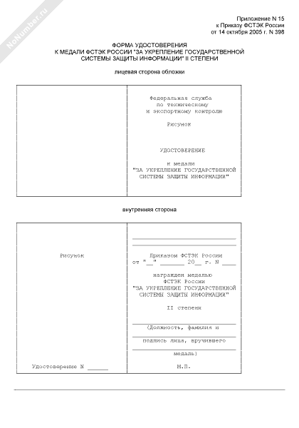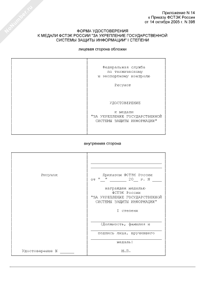 - 3687Форма удостоверения к медали Федеральной службы по техническому и экспортному контролю России «За укрепление государственной системы защиты информации» I степени