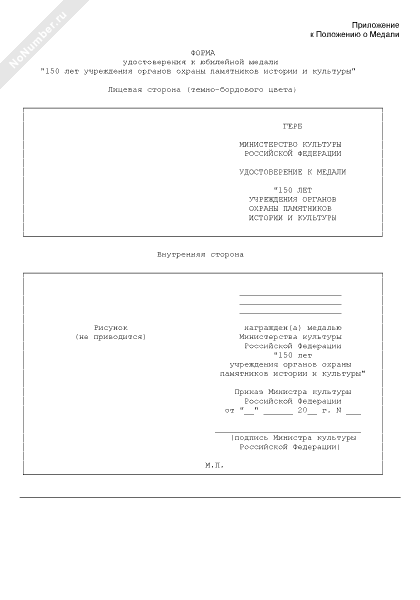- 3713Форма удостоверения к юбилейной медали «150 лет учреждения органов охраны памятников истории и культуры»