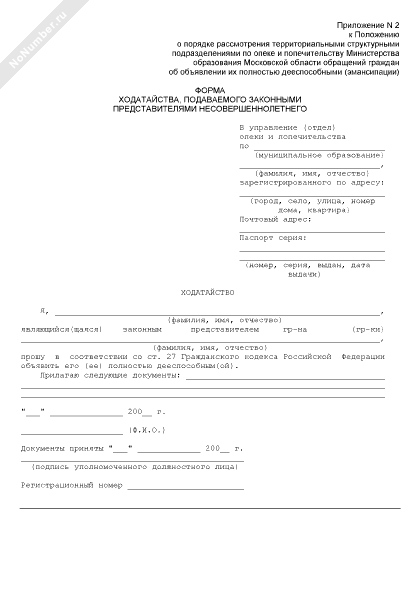 - 3758Форма ходатайства в органы опеки и попечительства Московской области, подаваемого законными представителями несовершеннолетнего о признании его полностью дееспособным