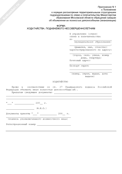 - 3757Форма ходатайства в органы опеки и попечительства Московской области, подаваемого несовершеннолетним о признании его полностью дееспособным