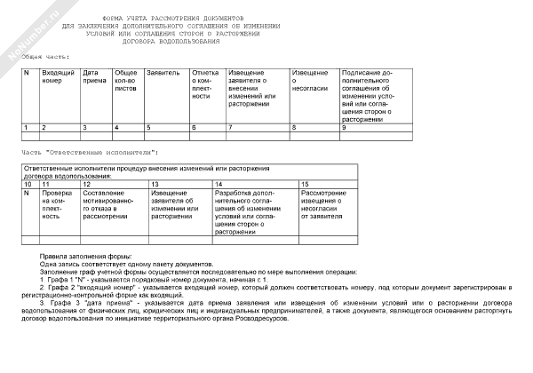 - 3746Форма учета рассмотрения документов для заключения дополнительного соглашения об изменении условий или соглашения сторон о расторжении договора водопользования