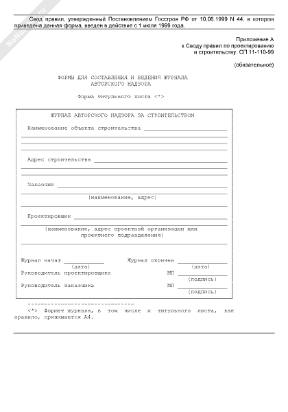 - 3803Формы для составления и ведения журнала авторского надзора. Форма титульного листа журнала авторского надзора за строительством