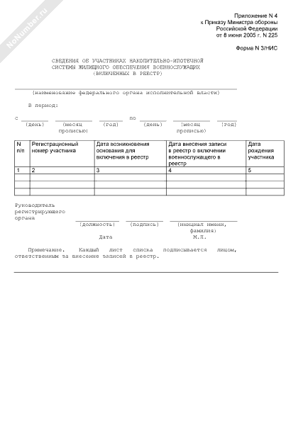 - 3816Формы документов, необходимых для формирования и ведения реестра участников накопительно-ипотечной системы жилищного обеспечения военнослужащих. Cведения об участниках накопительно-ипотечной системы жилищного обеспечения военнослужащих (включенных в реестр). Форма № 3/НИС