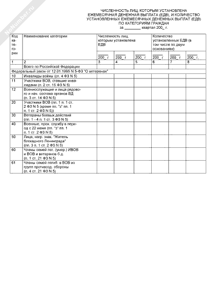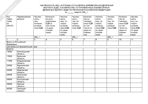 - 3901Численность лиц, которым установлена ежемесячная денежная выплата (ЕДВ), и количество установленных ежемесячных денежных выплат (ЕДВ) по регионам Российской Федерации. Форма № 6-ФР (квартальная)