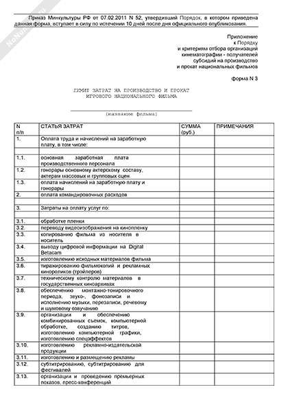 - 3917Лимит затрат на производство и прокат игрового национального фильма (форма № 3)