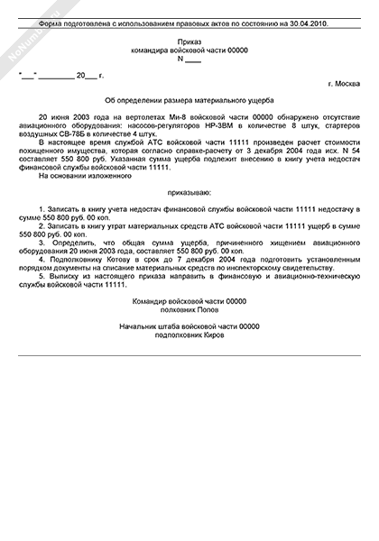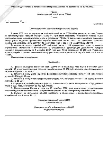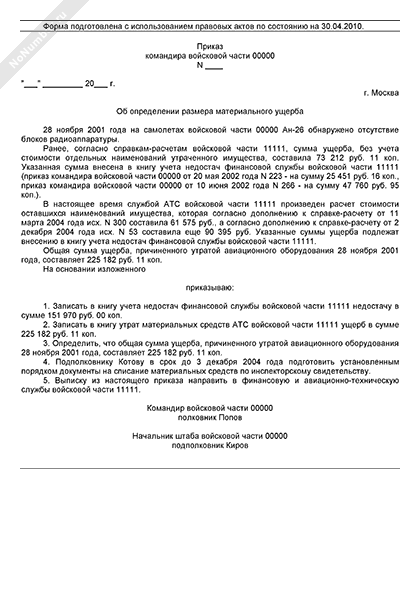 - 3937Примерная форма приказа командира войсковой части об определении размера материального ущерба, причиненного утратой авиационного оборудования