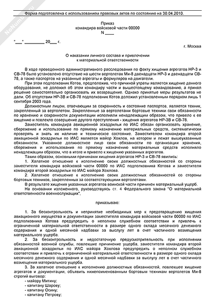 - 3939Примерная форма приказа командира войсковой части о наказании личного состава и привлечении к материальной ответственности по результатам проведенного административного расследования по факту хищения имущества