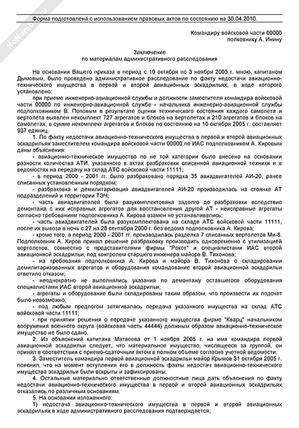 - 3931Примерная форма заключения по материалам административного расследования по факту недостачи авиационно-технического имущества в войсковой части