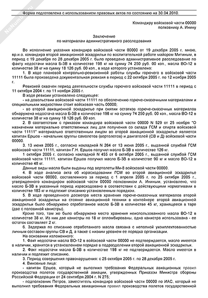 - 3930Примерная форма заключения по материалам административного расследования по факту недостачи горючего в войсковой части