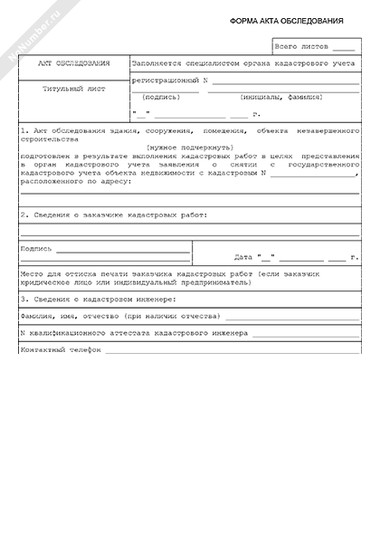- 3968Форма акта обследования здания (сооружения, помещения, объекта незавершенного строительства) на основании сведений, полученных в результате осмотра места нахождения объекта недвижимости с учетом сведений государственного кадастра недвижимости, а также иных документов, подтверждающих прекращение существования объекта недвижимости