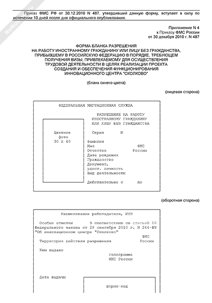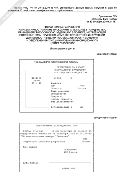 - 3971Форма бланка разрешения на работу иностранному гражданину или лицу без гражданства, прибывшему в Российскую Федерацию в порядке, не требующем получения визы, привлекаемому для осуществления трудовой деятельности в целях реализации проекта создания и обеспечения функционирования инновационного центра «Сколково»