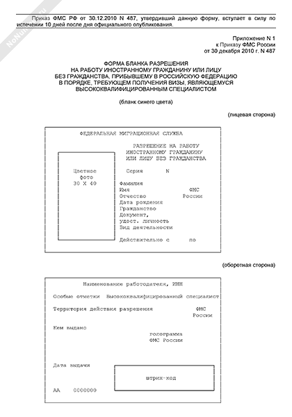 - 3970Форма бланка разрешения на работу иностранному гражданину или лицу без гражданства - высококвалифицированному специалисту, прибывшему в Российскую Федерацию в порядке, не требующем получения визы