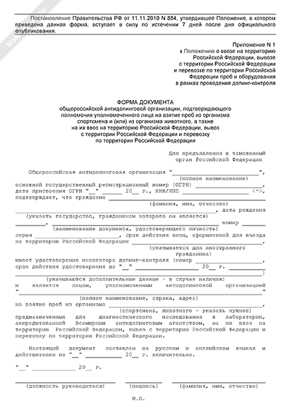 - 3978Форма документа общероссийской антидопинговой организации, подтверждающего полномочия уполномоченного лица на взятие проб из организма спортсмена и (или) из организма животного, а также на их ввоз на территорию Российской Федерации, вывоз с территории Российской Федерации и перевозку по территории Российской Федерации